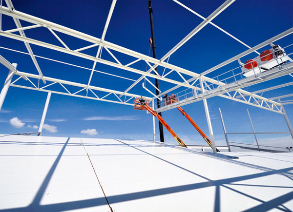 Rucphen - Nu nog onder een strak blauwe hemel bouwen werknemers van De Kok Staalbouw en Breda Bouw aan de dakconstructie op de helling van een nieuwe indoor skihal op het terrein van Sneeuwattractiepark Skidôme in Rucphen.