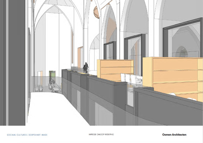 Om dit alles een plek te kunnen geven, is er een vide gecreëerd binnenin de kerk en komt er een uitbouw aan de achterkant. Die krijgt een dubbelfunctie: "Een grote zaal die je kunt inrichten als theaterzaal voor de verenigingen, maar die je ook kunt opknippen in kleine zalen", zegt Schuitmaker.